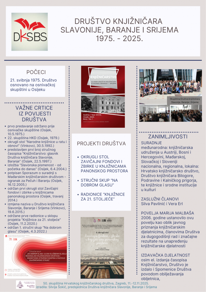 Predsjednica Društva Marija Čačić održala je 8. listopada 2020. godine izlaganje 45. obljetnica rada Društva knjižničara Slavonije, Baranje i Srijema na virtualnoj konferenciji 45. skupštini Hrvatskoga knjižničarskog društva Knjižnice u doba krize.